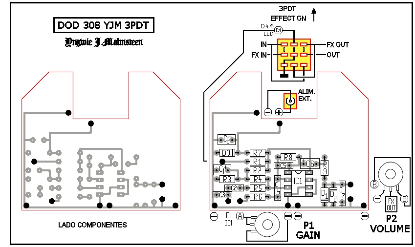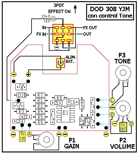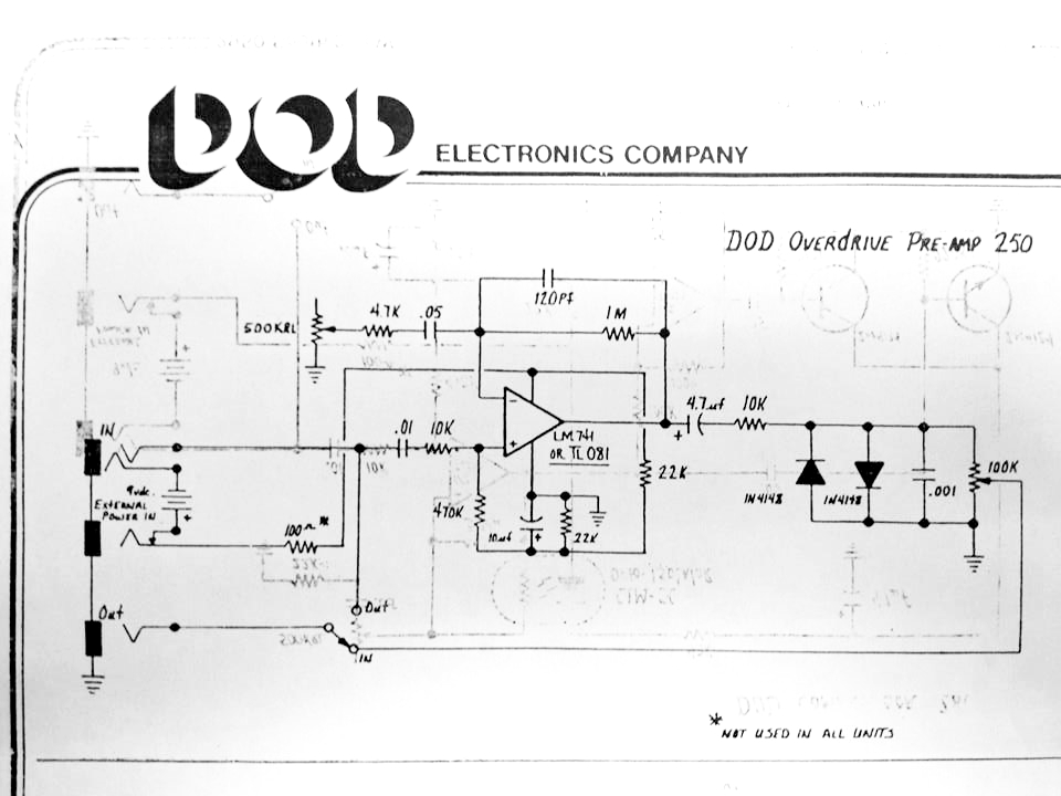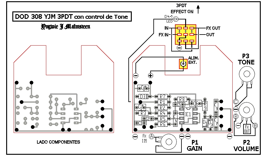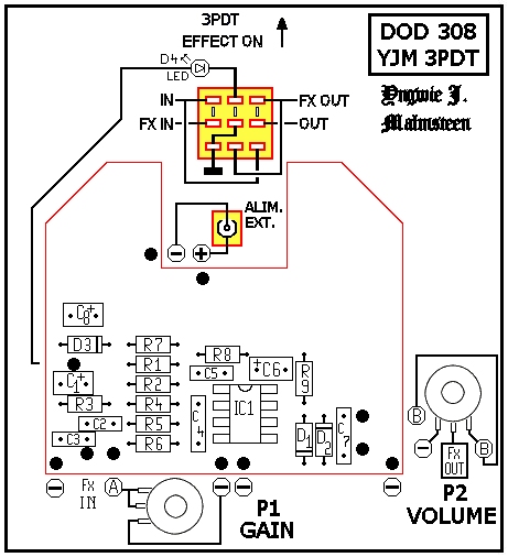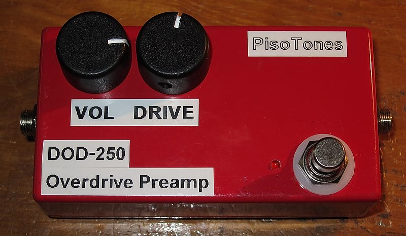 Como podéis ver en las cutres pegatinas del pedal, se trata del "DOD-250 Overdrive Preamp" y no del "DOD YJM308 Yngwie J Malmsteen Preamp Overdrive". Realmente ambos circuitos son prácticamente idénticos y la diferencia más importante entre ellos es el condensador de entrada, de 1nF en el 308 y de 10nF en el 250. Esta sola diferencia tiene un importante efecto en el comportamiento final del pedal de modo que, según mi experiencia, el 250 es más "gordo" de sonido y el 308 es más "fino".