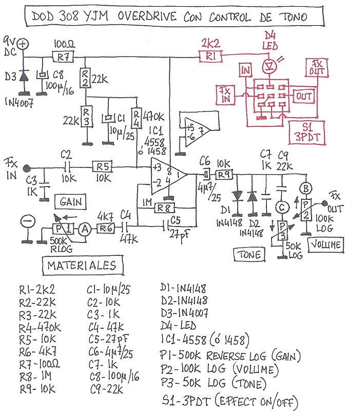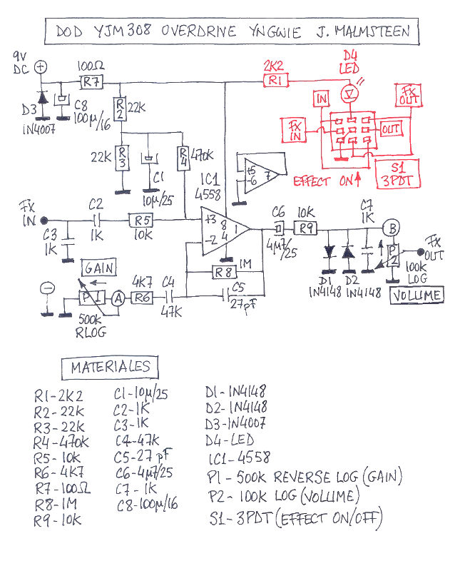 El esquema es casi idéntico al archiconocido MXR Distortion+. Los cambios son sutiles, pero suficientes para que valga la pena montarlo. Además, los componentes son muy fáciles de conseguir en el mercado nacional, salvo el potenciómetro de Gain, de 500K Reverse Log. Yo no tengo problema porque en Musikding.de tienen de todo.