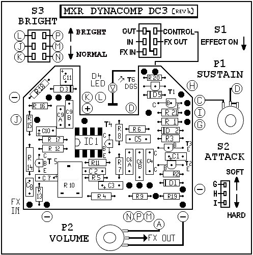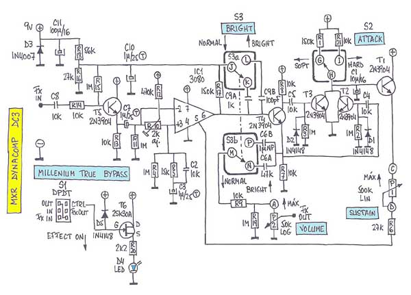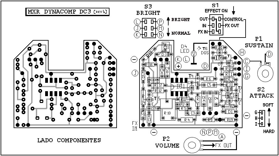 En esta tercera versión he añadido una modificación que leí en Guitarramanía. Creo que la cosa era original de Psst aunque quien hablaba de ella era Palp. Este es el link. El caso es que el Dynacomp entrega un sonido muy bonito pero bastante oscurillo. La modificación consiste en poder seleccionar mediante S3, un DPDT de palanca, entre el sonido "clásico" y un sonido más brillante. La combinación de los potenciómetros de Sustain y Volume con estos dos conmutadores (Attack y Bright) nos da una versatilidad tremenda. Si sumamos a estos factores las distintas pastillas de la guitarra obtenemos finalmente una barbaridad de variedad de sonidos.