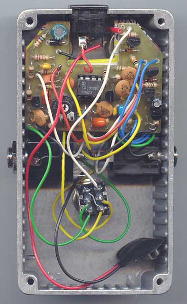 Con el diseño de la placa tuve que pelearme bastante hasta conseguir meter los nuevos condensadores C6b y C9b para seleccionar entre sonido clásico y brillante, pero finalmente lo conseguí. Ojo con los puntos de conexión tanto de S2 como de S3. Fijaos bien, no vayais a equivocaros, ya que está todo bastante apretadito en la placa y puede inducir a error. Aseguraos del cableado mirando el esquema. Insisto en este asunto porque yo me equivoqué cuando lo monté y tardé un ratillo en pillar el fallo. Observad también que la salida del circuito (Fx Out) se toma directamente del cursor del potenciómetro de "Volume" P2.