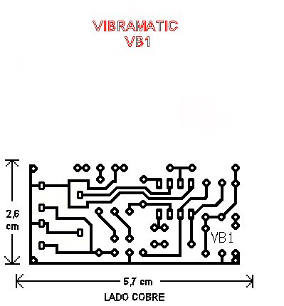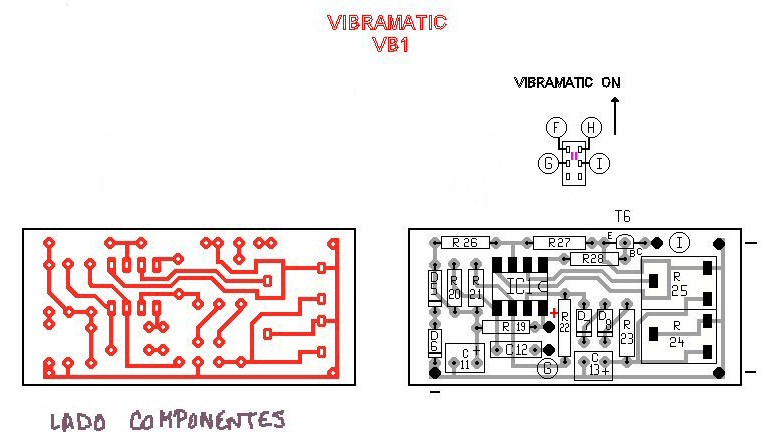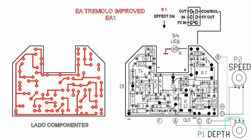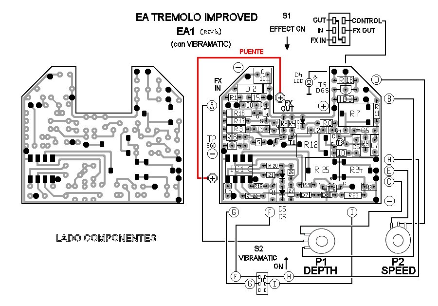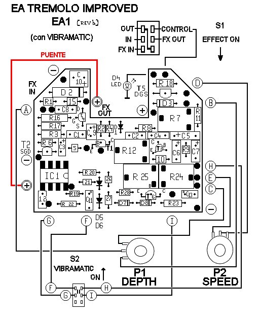 Quiero aclarar la posición de algunos puntos de conexión que no he podido acercar a los bordes de la placa: "FX IN" está a la derecha del punto "A" y junto al condensador C8; "FX OUT" está en el centro de la placa, justo debajo de la base del transistor T1. A la izquierda del FX OUT está el punto "F", que va al conmutador S2 (Vibramatic ON/OFF) Hay que hacer un puente para alimentar IC1. Lo he señalado en rojo. Aunque algunas pistas se acercan bastante entre sí en algunos sitios, creo que el montaje se puede realizar a mano sin ningún problema. Yo lo montaré en cuanto tenga ocasión.