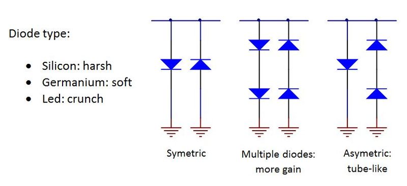 - Diodos: Los diodos que se proponen son una pareja de Silicio-Germanio. En el original eran los dos de Germanio pero la combinación Si-Ge, en mi opinión, da un resultado asimétrico más musical, pero no hay ningún problema en jugar con diferentes combinaciones de Si, Ge o LEDs. Incluso se pueden desactivar mediante un SPDT, por ejemplo en la unión común a masa, con lo que obtendremos un booster sin apenas distorsión, que tampoco está nada mal. Se pueden probar infinidad de combinaciones e incluso hacerlas todas seleccionables mediante conmutadores de varios circuitos, como los típicos giratorios: