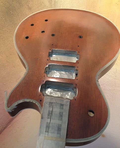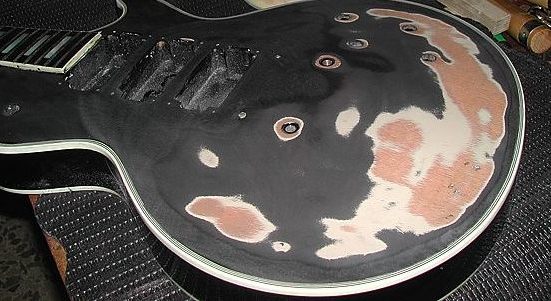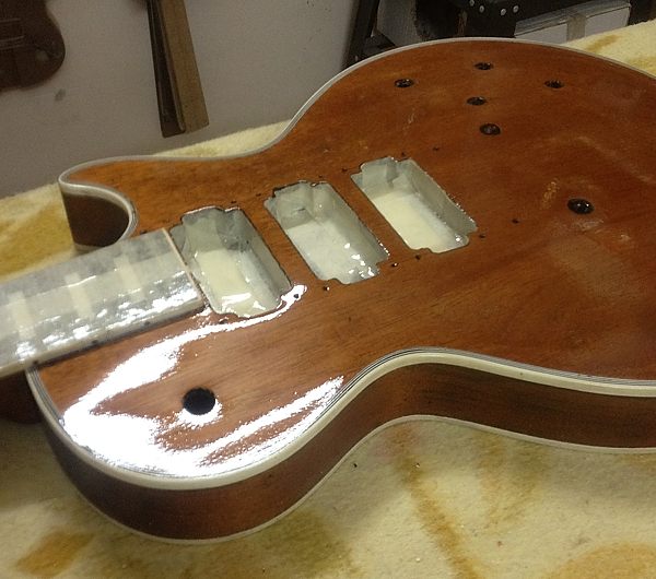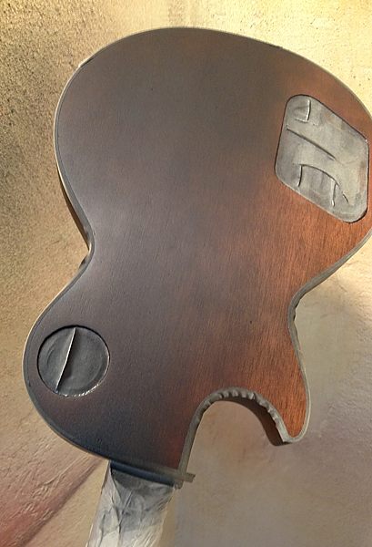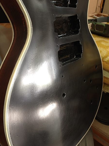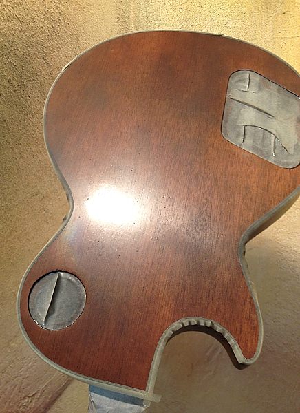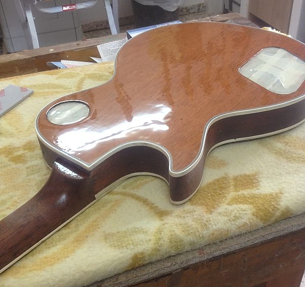 Durante el largo proceso de lijado se pudo comprobar que el barniz nitrocelulósico original había desaparecido por completo en el anterior lijado, pues bajo el poliuretano solamente había un aparejo gris para cerrar el poro de la caoba. Una chapuza. No quedaba más remedio que quitarlo todo y dejar que la nueva nitro permitiera vibrar y respirar de nuevo a esa madera tan noble, que estaba plastificada en barniz de poliuretano.