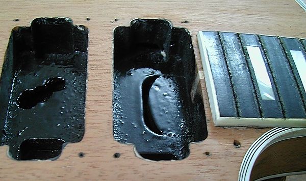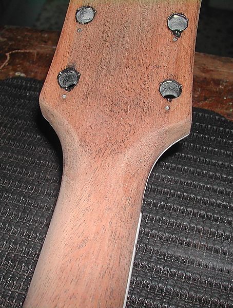 A continuación os pongo un par de fotos de la trasera de la pala. La primera, ya vista antes más arriba, es tal y como estaba pintada en poliuretano y con el número de serie tipo "Letraset". A continuación la pala ya lacada en nitrocelulosa, con los clavijeros ya instalados y con el número de serie hecho, como ya vimos, con un tampón con la fuente correcta, respetando el modo de hacer de esa época: