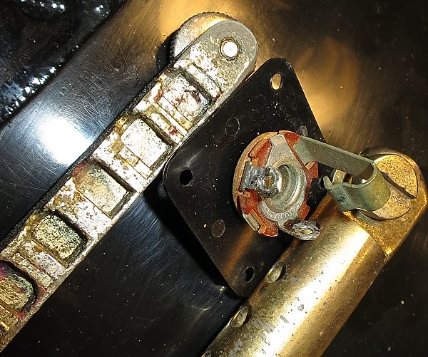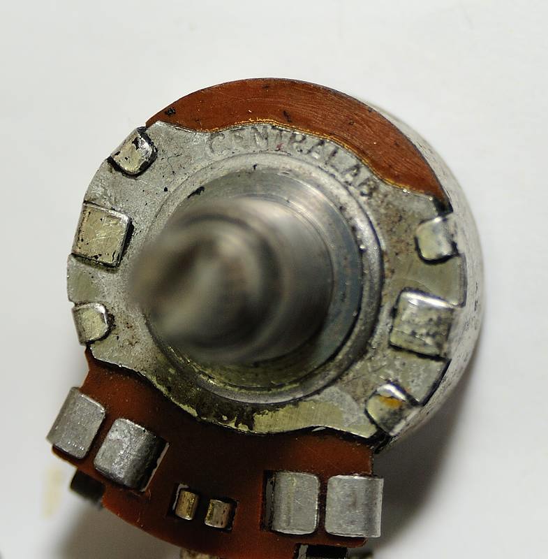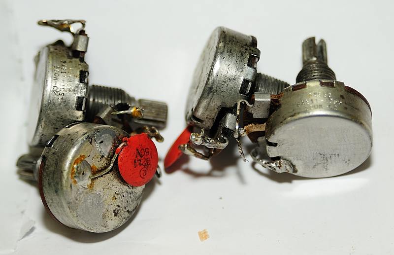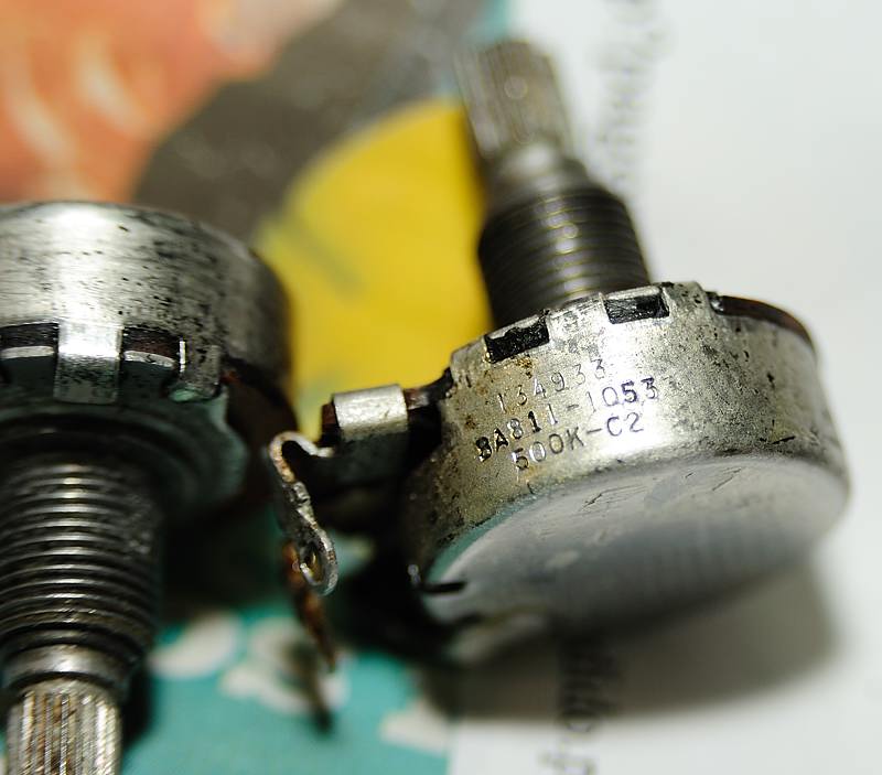 En cuanto a los potenciómetros, tal y como se indica en el esquema, no fue hasta 1973 que se cambiaron por potes de 300K por lo que en esta, al ser los originales, son de 500K log. cada uno, marca CENTRALAB y fechados en la semana nº33 de 1959: