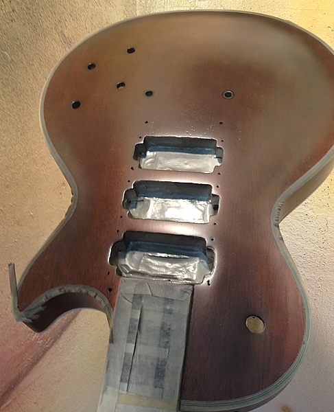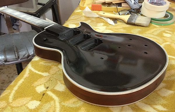 A continuación se ven varias imágenes del proceso de imprimado y pintado de la guitarra en laca nitrocelulósica: