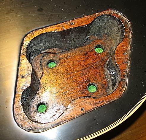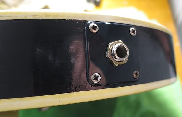 La placa del jack es la original negra de plástico fino, típico de la época. Es curioso que una guitarra de alta gama como esta no llevase esa pieza en metal dorado, pero así eran en su momento. También es curioso que, siendo la original, no se haya roto, pues es bastante frágil.