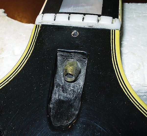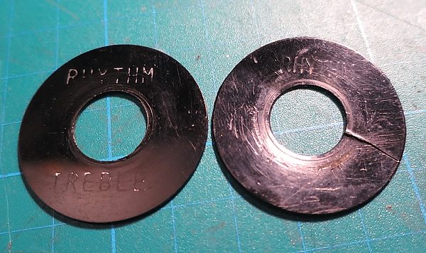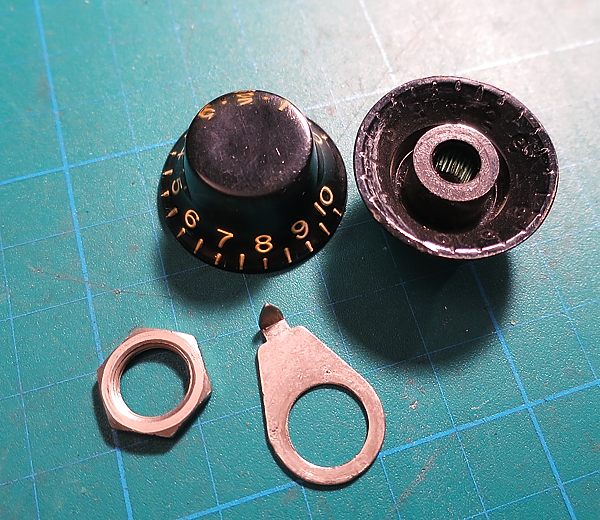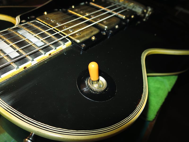 El anillo de plástico original del switch, también en el estuche, está partido (eran muy finos). La guitarra traía puesto uno de los '90 gastado pero entero. Se puso el original tras reforzarlo por la parte de atrás para evitar que siguiese partiéndose.