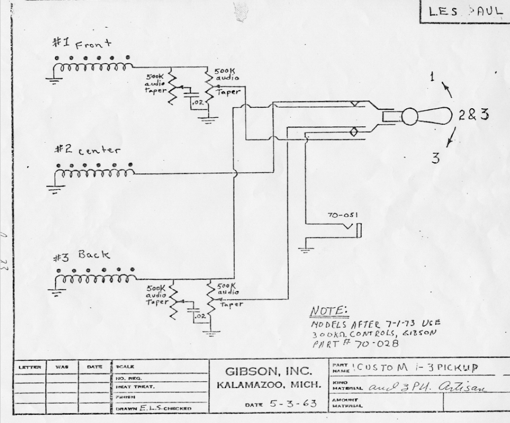Sobre esto hay bastante controversia pues en algunas webs y en algunos textos se asegura que la posición central de estas guitarras es "pastilla de mástil + pastilla de centro". Sospecho que la culpa de ello es de Andre Duchossoir (†2020). Este autor, conocidísimo experto de gran prestigio y muy bien documentado, en su libro "Gibson Electrics - The Classic Years" edición de 1994, libro de referencia en cuanto a Gibson, indicaba en la página 78 que en efecto la posición central es "mástil + centro". Sin embargo, en el mismo libro pero en su edición actualizada de 1998, en la página 202, indica lo contrario, que la posición central es "centro + puente". Probablemente fué una errata de la primera edición del libro pues todos los esquemas originales de Gibson para las Les Pauls de 3 pastillas que he podido encontrar, incluido el correcto para esta guitarra (ved más abajo) indican que esta última es la opción correcta. He leído ambas ediciones del libro "Gibson Electrics - The Classic Years", pero no puedo reproducir lo que aquí os cuento por estar expresamente prohibido por el editor (Hal-Leonard) pero creedme que es así.