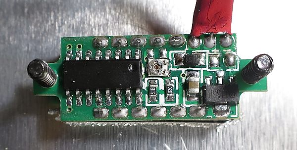 Como véis en el esquema de la placa, he añadido un voltímetro digital al montaje. De nada nos sirve estar modificando la tensión de salida si no sabemos qué tensión estamos obteniendo. Para ello he usado un baratísimo y bastante preciso voltímetro digital que he comprado en DealXtreme (SKU:278165) pero que también podréis encontrar en ebay, Banggood, Ali Express y el resto de sospechosos habituales. El precio es ridículo y funciona la mar de bien. Eso sí, debéis tener en cuenta el conseguir uno de "los de tres cables". En el esquema véis estos tres cables con su código (real) de colores: