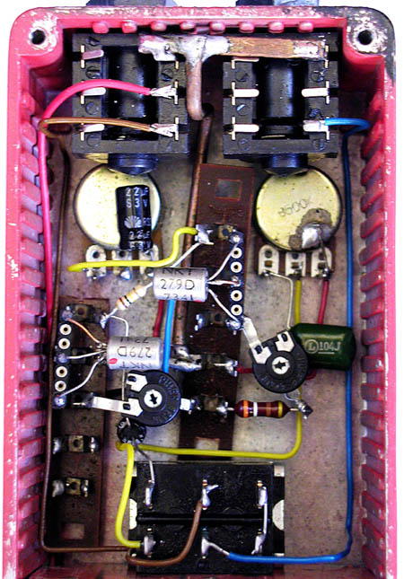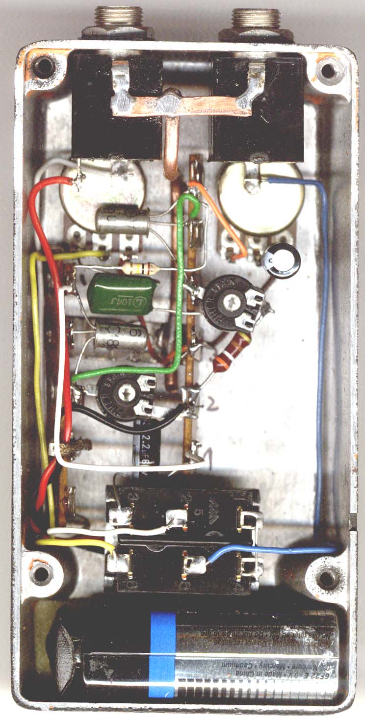 Se trata de un efecto radicalmente diferente del TubeScreamer que presentamos hace algún tiempo. El TS pertenece al género de los conocidos como "Overdrives" o saturaciones suaves. El FF pertenece a los de tipo "Distortion" o más concretamente, los "Fuzz", nombre que precisamente proviene de él. A éste tipo pertenecen una millonada de clónicos y "primos" que le salieron inmediatamente. Prácticamente todos los "Fuzz" eran modificaciones más o menos sustanciales del FF. También había "Fuzzes" con circuitería totalmente diferente, entre los que sobresale el famoso Electro-Harmonix Big Muff Pi, con sus cuatro etapas de preamplificación encadenadas, pero de él ya hablamos en su propia página.
