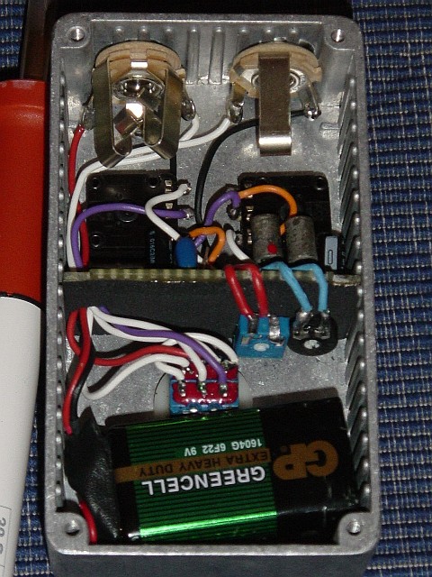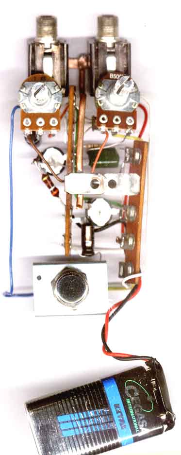 La mayoría de los detalles de construcción son idénticos a los del resto de los pedales que se describen en la sección de "Artículos" por lo que os dirijo allí para verlos. Ahora bien, tened en cuenta que una de las características" menos apreciadas de los transistores de Germanio es que tienen la mala costumbre de "fundirse" si nos pasamos de tiempo con el soldador. Para ello precisamente estos transistores, al menos los más antiguos, vienen con unas patitas larguísimas para lo que es normal hoy en día. Facilmente de unos 5cm de longitud. Mi consejo es que las enfundéis con trozos de envoltura de plástico que obtengáis de pelar algún cable y que no cortéis las patitas. Después de soldar, dobladlas para que quepan en la caja. La funda de plástico se encargará de que no se cortocircuiten. Utilizad el mismo método de precaución en el soldado que usábamos con el FET en el artículo de detalles de construcción de pedales