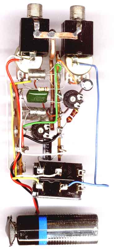 El método utilizado es el de "regleta de conexiones" como el que se utilizaba antiguamente en la época en que todo era "a válvulas" y en chasis. Un método sencillo y eficaz. Fijáos cómo se ven perfectamente los componentes, los dos transistores de Germanio (AC-188 N.O.S.) y los dos "trimmers" (resistencias variables) de ajuste de bias. Estos trimmers han de sustituir a las resistencias de valor 33K y 8K2.