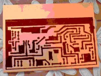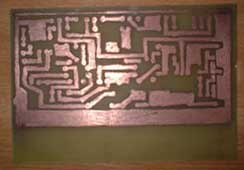 Cuando rematamos este proceso debemos de limpiar bien la placa. Esto lo hago con un estropajo fuerte de los verdes, y frotando bien hasta que quedan las pistas de cobre brillantes y limpias de tinta, quedandonos algo asi: