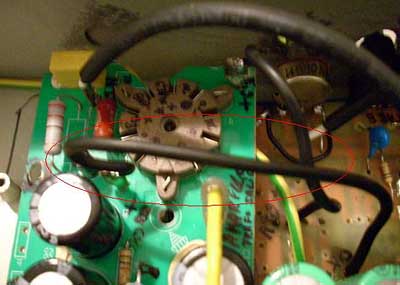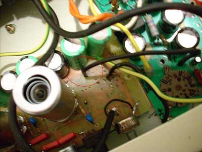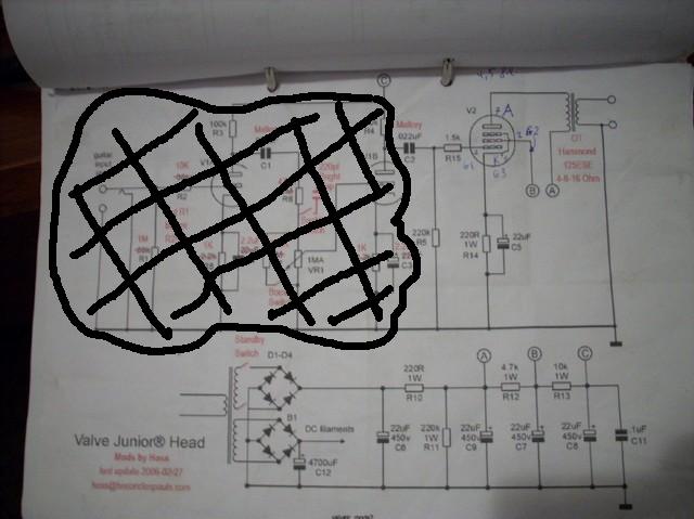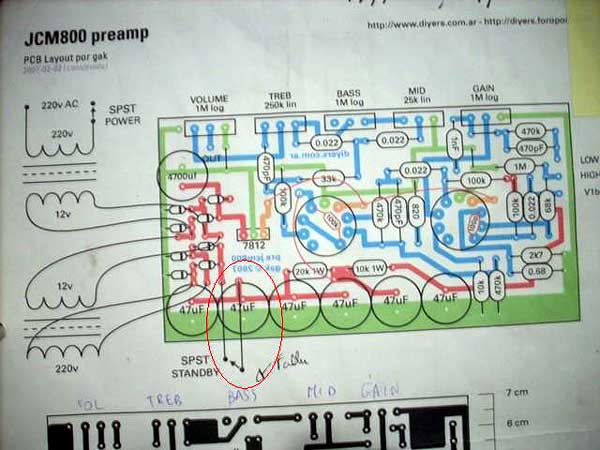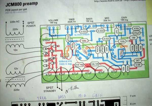 En la placa del previo del JCM prescindiremos de los 8 diodos 1n4007 porque ya cogemos la corriente rectificada del GA-5; y suprimiremos tambien el 7812, el regulador de 12 voltios, puesto que alimentaremos los filamentos de las válvulas del previo a 6,3 voltios de continua directo tambien de la placa del GA-5. El transformador de alimentación parece estar suficientemente sobredimensionado como para poder suministrar alimentación a la nueva válvula sin problemas ni calentamiento.