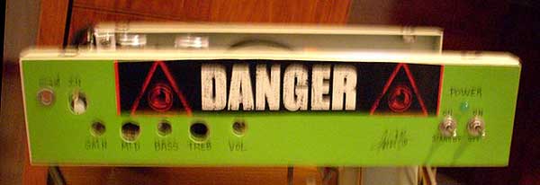 Luego me las arreglé para sujetar las 2 placas, la del previo y la de la etapa, aprovechando los separadores que traía el ampli, reubicándolos según mis necesidades. Cada uno tendrá que distribuir a su gusto. Me preparé un frontal más que nada para tapar los agujeros que quedaban después de cambiar de sitio todos los potes, interruptores y demás y asi fue como me quedo: