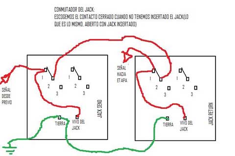 Añadi también un loop de efectos pasivo. Al send nos llega el vivo directo de la salida del previo JCM (el cable apantallado que sale del pote volumen) y del return va directo a la entrada de la etapa, tambien con cable apantallado. Los jacks que se usan son unos de conmutacion que tienen unas patillas que según metes un jack cortan o abren el circuito. Si no usáis esto, directamente lleváis un cable apantallado del previo a la etapa. Si decidís insertarle el loop seguid este diagrama: