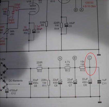 -El punto C del esquema que se muestra abajo es desde donde tomaremos la tensión para la placa del previo donde tenemos aproximadamente 290 voltios (después de r-13 de 10k)
