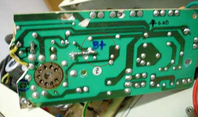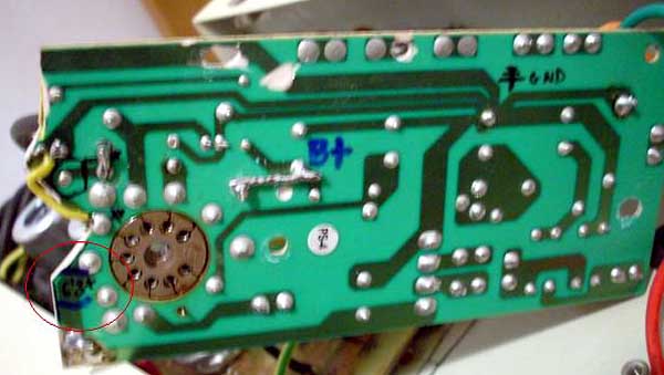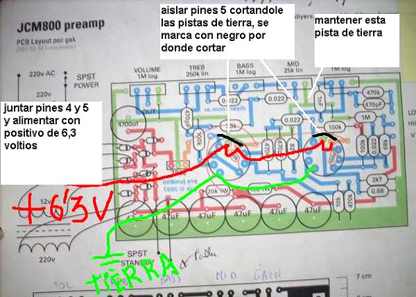 Llegados a este punto debemos tener cuidado porque necesitamos hacer otro cambio en la placa del JCM. Como antes alimentabamos a 12 voltios los filamentos, poníamos la masa al pin 4 de las válvulas del previo pero como ahora alimentaremos a 6,3 voltios, la masa la debemos conectar al pines 9 de las válvulas, que antes nos quedaban libres y cortaremos el trozo de la pista de masa que iba antes al pin 4 pues ahora debemos juntar el pin 4 con el 5 que es por donde irán los +6,3 voltios.