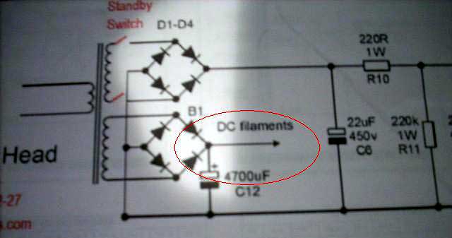 - La salida de la corriente rectificada para los filamentos es donde pone "DC filaments". Desde aquí alimentaremos, ya en contínua y filtrado, a nuestros filamentos a unos 6,3 voltios.