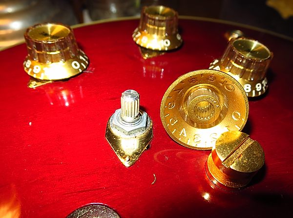 Los potenciómetros, de marca ALPS, japoneses, tampoco son "al uso" de Gibson. Aunque la configuración es la misma que en una Les Paul, el valor de los potes de volumen y tono son diferentes entre sí, pues los de volumen son los típicos de 500K pero los de tono son especiales en tanto que: