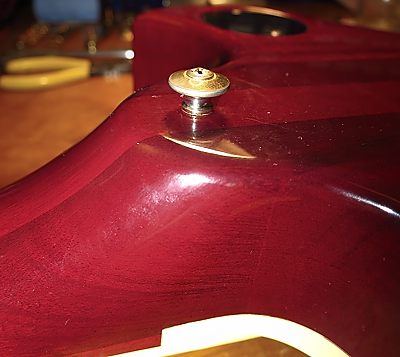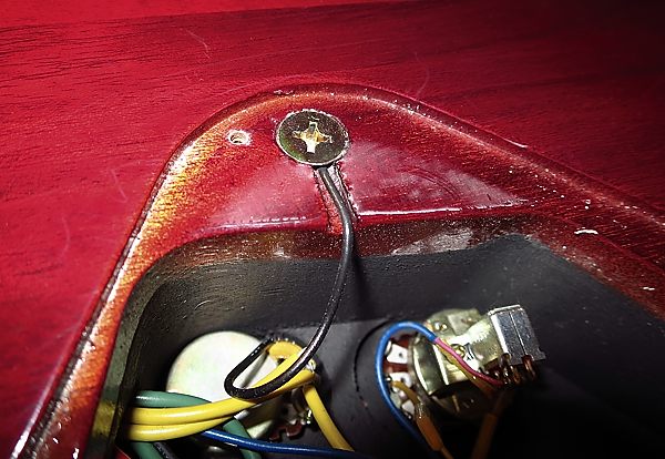 Sin duda serán difíciles de reponer. En la cavidad de los potes podemos ver un gran tornillo que es el encargado de conectar la masa del circuito con el cordal y, por lo tanto, con las cuerdas.
