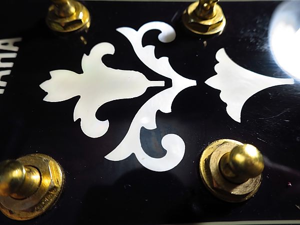 El mástil está contruido en base a tres piezas: caoba-arce-caoba, más unas "alas" de caoba en la pala al estilo Gibson y binding color crema. El "bigote" de la pala es similar, que no igual, al de Gibson, con una cubierta plástica en la que vemos un bonito dibujo floral y el logo de Yamaha. En principio parecen unas incrustaciones de madreperla pero un análisis más detallado nos hace ver que en realidad se trata de una base de plástico nacarado MOTO (Mother Of TOiletseat) con una serigrafía negra por encima delineando los dibujos y el logo. Tiene también un binding, esta vez de sólo 5 capas (blanco-negro-blanco-negro-blanco) realizado del mismo modo.