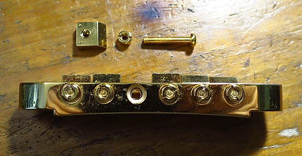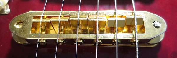 Otra de las características típicas de estas guitarras es el puente con su placa inferior de latón para dar más masa y sustain al conjunto... y más peso, claro. Etiquetado en la trasera como "YAMAHA", es una curiosa construcción un poco mezcla entre el Gibson ABR-1, por el sistema de ajuste de altura, y el Gibson "Nashville" por el alcance de las silletas y aspecto general.