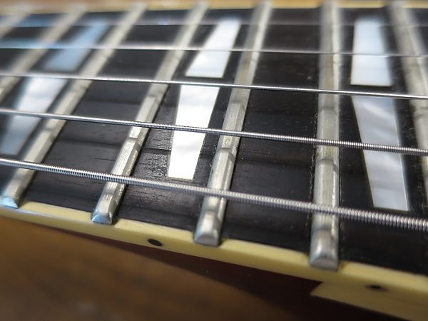 Los trastes son de tamaño "Medium-Jumbo", con acabado "chato" parecido a los de Gibson pero no tienen nibs laterales.