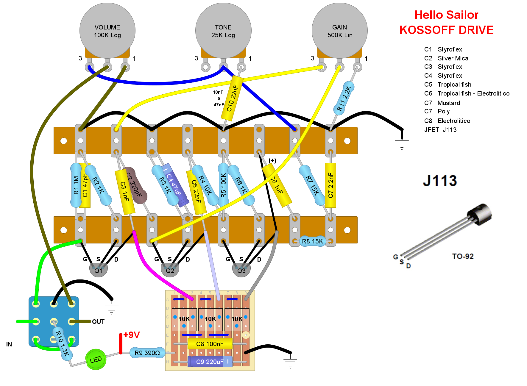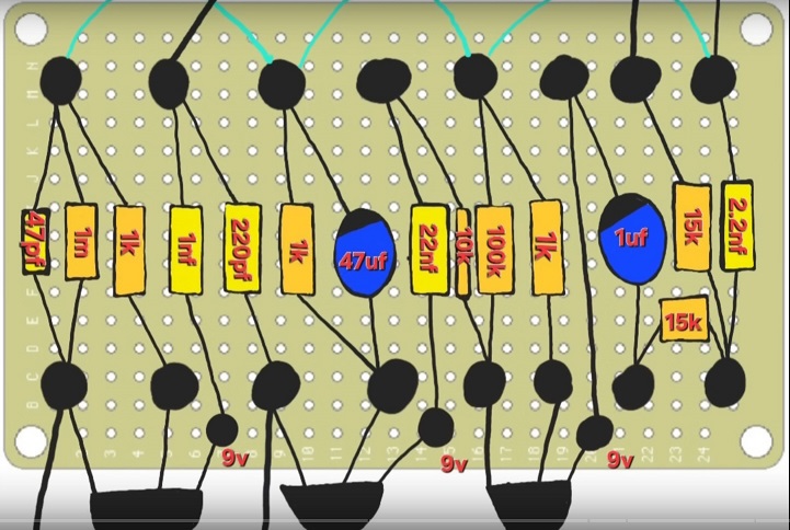 Según él, lo diseñó para obtener el tono de Paul Kossoff, su guitarrista favorito, de la manera mas fiable posible y como podéis ver en ese vídeo indica paso a paso, aunque de un modo bastante confuso, cómo fabricarse el pedal. Digo confuso porque "olvida" comentar algunas cosas y con otras pasa sobre ellas demasiado deprisa como para que se entienda bien. Ni siquiera presenta un esquema y el diagrama dibujado a mano alzada, como veremos más tarde, tiene un pequeño error. Ya desde la carátula de ese YouTube puedes ver que se trata de un montaje punto a punto, aunque hecho en una regleta de conexiones y no con turrets como ahí se ve. Usó componentes antiguos axiales tal y como se aprecia en la imagen de portada del YouTube, aunque ahí ni siquiera estén soldados a los turrets. Él mismo anima a hacerlo con componentes nuevos pues la diferencia de sonido apenas será perceptible, sobre todo en un efecto de alta ganancia como este.