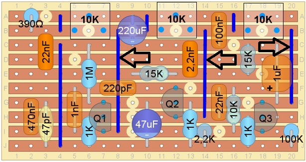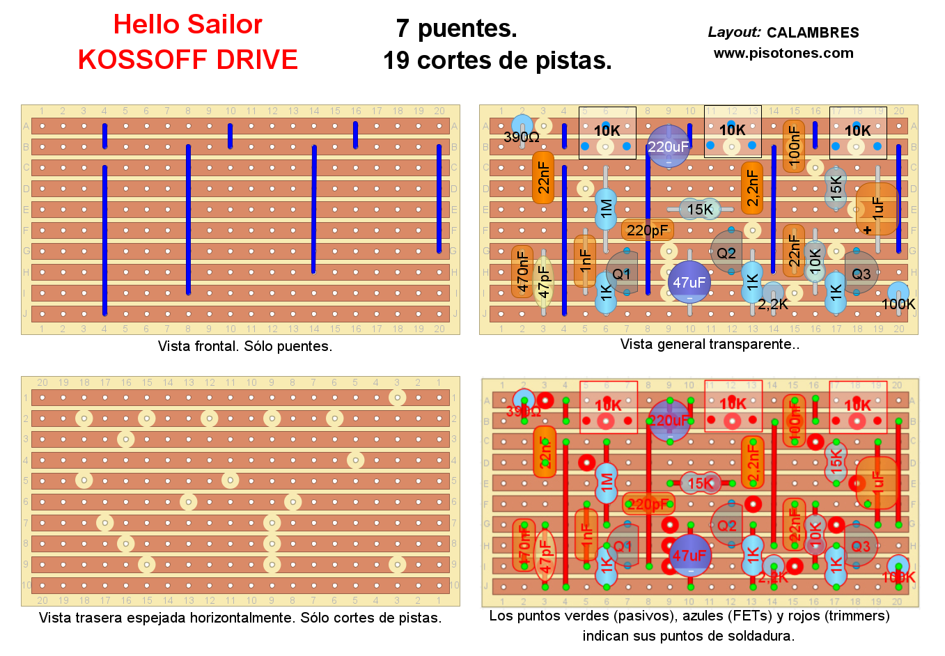Pero si no te quieres complicar la vida ni siquiera con esto, directamente pon cada uno de los tres trimmers en su punto medio y empieza a ajustar desde ahí. Para ello primero pon todos los potenciómetros (Tono, Ganancia y Volumen) a tope y ajusta el trimmer de la izquierda correspondiente a la primera etapa (Q1) hasta que vaya sonando bien. A continuación ajusta del mismo modo Q2 con el trimmer central para luego seguir con Q3 con el trimmer de la derecha. Una vez hecho esto, vuelve a empezar con Q1, Q2 y Q3 y quizá una tercera vez pues los ajustes de cada uno de los trimmers son interdependientes y lo que hagas con uno afectará al ajuste de los otros dos. Así hasta que suene lo mejor posible. La experiencia me dice que los ajustes finales de los trimmers suelen estar entre la 1 y las 2 en referencia horaria (entre las 10 y las 11 si pones los trimmers "al revés" como en el proyecto original de Hello Sailor y/o el layout P2P de más arriba), pero dependerá de los J-FETs.