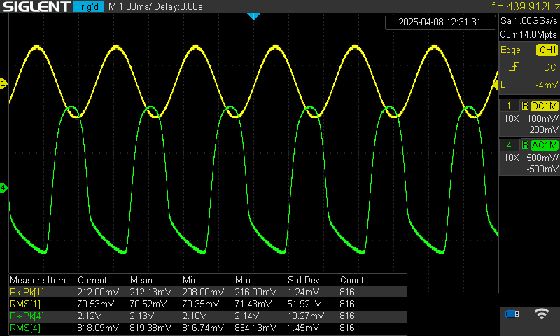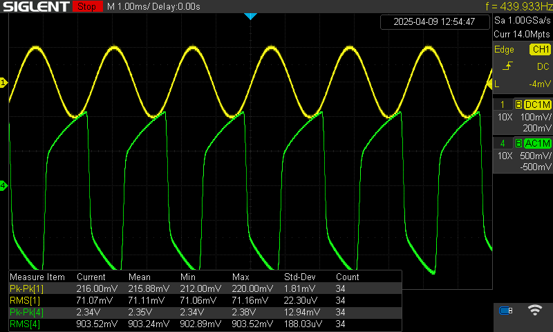 Si disponéis de un osciloscopio, aseguraos de obtener una respuesta como la que se ve en el gráfico anterior, con distorsión más o menos simétrica. Si acaso alguno de los J-FETs fallara, la curva no sería así y sería probablemente con distorsión asimétrica. Pinchando en este enlace puedes ver un oscilograma con alguno de los J-FETs dañado y en ese caso debéis revisar el circuito y sustituir el o los J-FETs que se hayan estropeado. En ambos oscilogramas los tres potenciómetros están a tope y se ha inyectado a la entrada del circuito una señal senoidal de 215mVpp y 440Hz).
