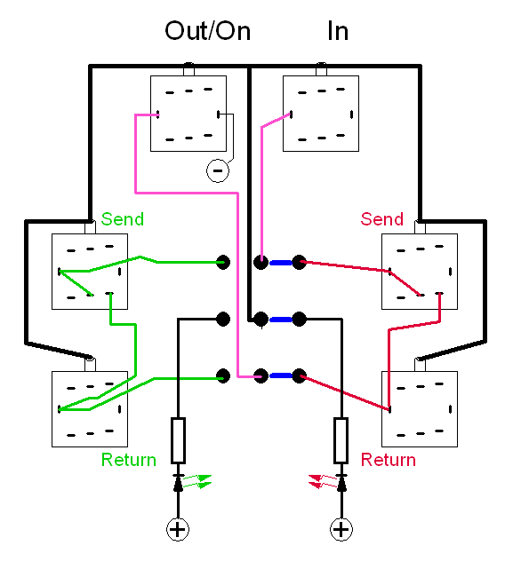 La representación esquemática del 3PDT está activando el Bucle 1 (rojo). Los "actuadores" del switch están aquí representados en azul. Si seguís lógicamente el funcionamiento, veréis que tal y como está activado el 3PDT, la señal que entra por el jack superior derecho (guitarra) se conmuta al jack de "Send" en donde pondremos nuestro pedal o pedales de efecto y que acaba en el "Return" para ser enviado a la salida del jack superior izquierdo que irá al ampli.
