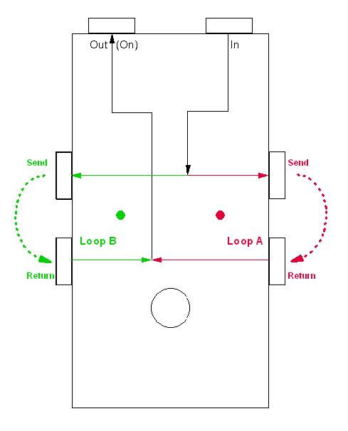 Si tenemos seleccionado el bucle 1 podemos seguir la vía lógica a través de la línea discontínua roja desde el "Send" del bucle1 al "Return" del mismo bucle, con lo que es redireccionado hasta la salida principal del pedal "Out". El Bucle 2, representado en verde es idéntico al primero.