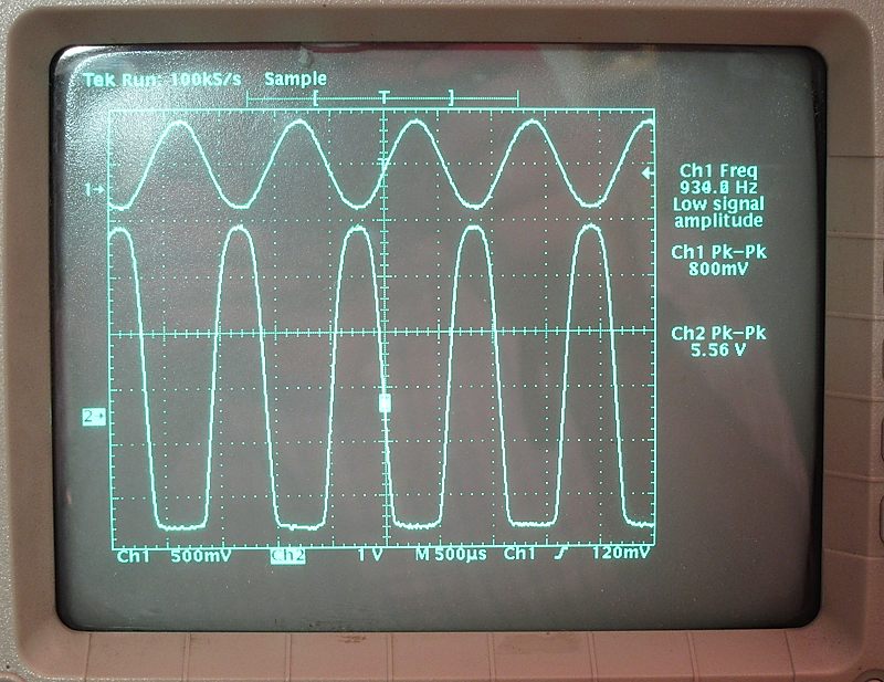 Del mismo modo, a la derecha de los oscilogramas podéis ver las medidas de las ondas para que os hagáis una idea: la amplitud pico a pico de la entrada es de 800mV y la de salida es de 5.56V, casi siete veces más.