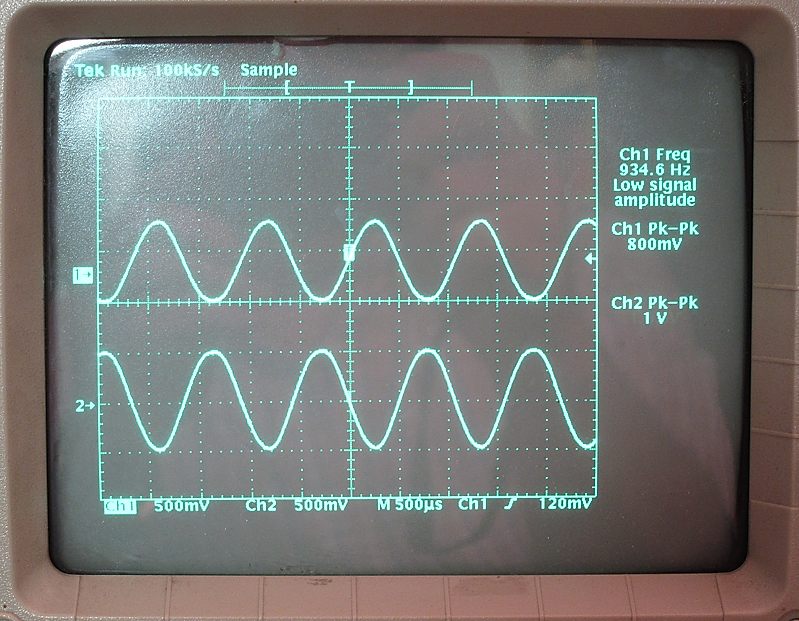 La onda de salida es MUCHO mayor, no sólo directamente visible sino que si os fijáis abajo veréis que el canal 2 ahora está en escala de 1V, esto es, el doble por unidad de medida que el canal 1. Esto está así porque si no, la representación de la onda sería tan grande que no cabría en la pantalla. Para que os hagáis a la idea, a la escala del canal 1, el 2 sería el doble de alto (doble de amplitud) que lo que véis en la foto.