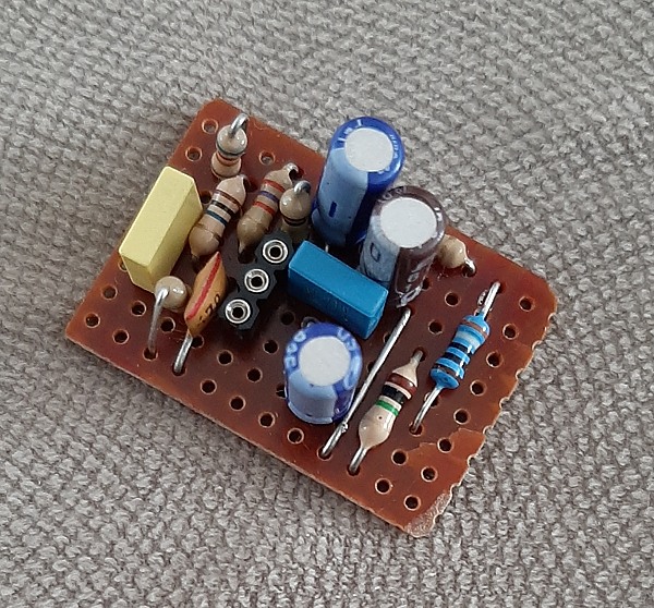 Este podría ser un montaje ideal para un principiante pues es sencillísimo de hacer. Precisamente teniendo esto en cuenta he diseñado una placa en "VERO board" para que su realización sea lo más fácil posible. Como veréis la placa es pequeña y cabrá en cualquier caja.