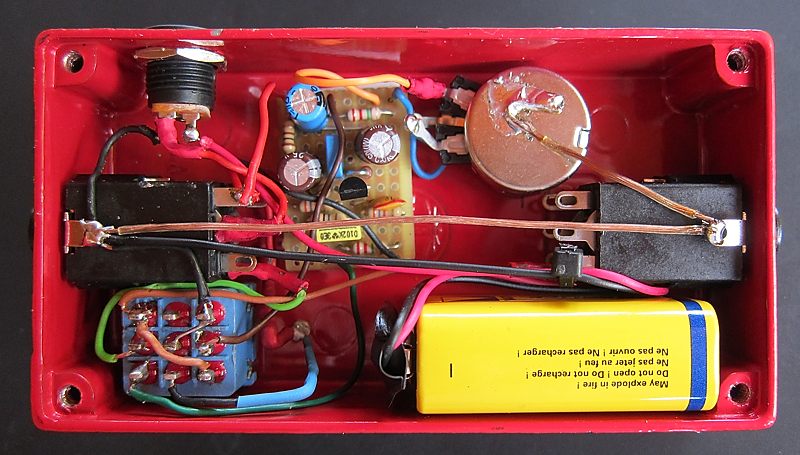 Como habéis visto, el diseño de la caja es bastante más sencillo (cutre) que en los pedales anteriores, pero es que desde hace años que estoy solo en esto y sin "departamento mecánico-artístico" encargado de aquellas estupendas cajas y sus serigrafías. Además ahora digamos que estoy "atado" a usar ese tipo de cajas con un tamaño y una disposición de jacks que no me gusta nada pero, por ahora, es lo que hay....