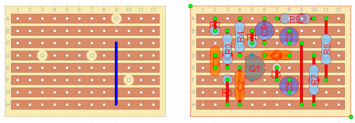 La vista de la derecha es la misma pero con los componentes ya puestos. Los puntos verdes (azules para el transistor MOS-FET) indican los puntos de soldadura.