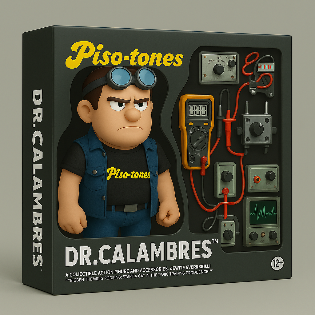Muñeco de acción del Dr. Calambres en caja estilo juguete coleccionable, con sus famosos "lupos" y acompañado por herramientas electrónicas como multímetros, osciloscopios y otros dispositivos técnicos además de una jerga indescifrable y erratas en la parte inferior del envoltorio, muy en la línea de su célebre página web. El muñeco luce su famosa pose de gruñón, tan característica del personaje y que tantos años ha empleado en perfeccionar.