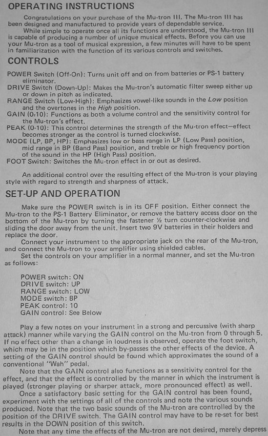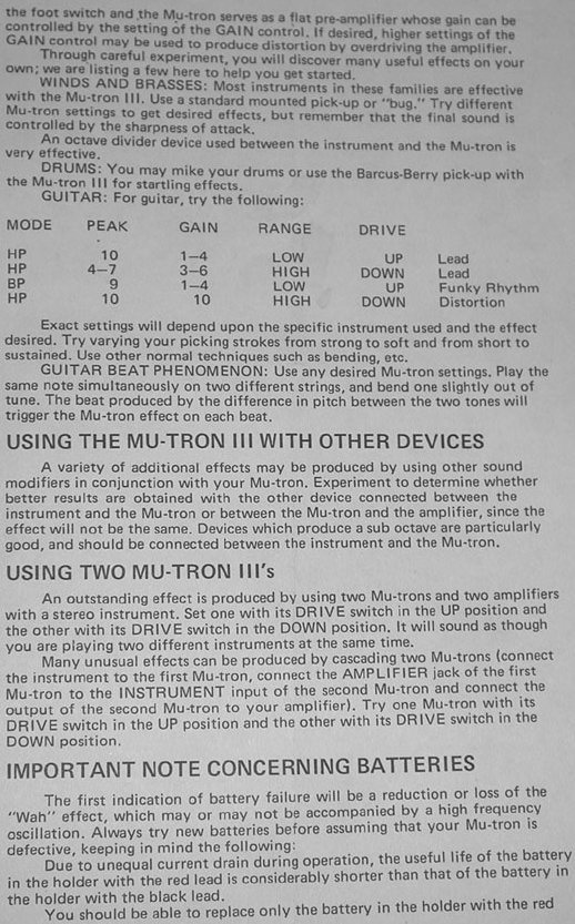 En la web podéis encontrar fácilmente los manuales de la reedición Mu-Tron III + pero si queréis leer los originales, podéis encontrarlos en la web de DiscoFreq. Parece que últimamente no está disponible esa web pero tampoco os molestéis mucho porque eran unos scans que se leían fatal. Si queréis una copia mucho mejor: