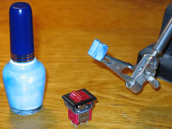 ...y aprovechando que ya tenía fuera el botón basculante decidí el darle otro guiño al original pintándolos de azul y rojo. Para ello utilicé laca de uñas de la barata que podéis encontrar en los chinos. Tendréis que dar varias manos de pintura para tapar del todo el negro original, teniendo cuidado de no hacer demasiado gruesa la capa pues tropezaría con el marquito de plástico.