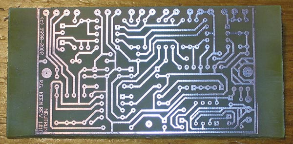 La placa de circuito es algo peliaguda de hacer. Aconsejo usar métodos fotográficos y no usar sistemas más caseros como fotocopias, a mano, etc pues las pistas son muy finas y están muy juntas. Los "pads" son tan finos que os sugiero que uséis una broca de 0.8mm para los taladros. En cualquier caso si no os sentís cómodos con esto siempre podéis comprarle la placa a J. D. Sleep a través de su web www.generalguitargadgets.com.