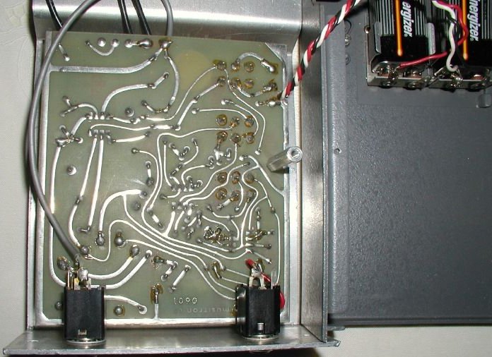 ...y no olvidéis conectar la alimentación (pila o alimentación externa) a los puntos BAT(+) y BAT(-). El punto "0V" lo debéis conectar al punto "Input Stereo Lug" del jack de "IN" del modo tradicional usado para conmutar la pila en el resto de montajes. El transistor Q1 se encargará de hacer de conmutador de funcionamiento.