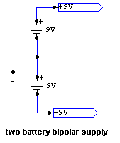 Lo más fácil es alimentar el circuito tal y como aparece en el fichero Neutron (pdf). Para ello tomaremos dos clips de pilas de 9V y uniremos el cable rojo de uno con el negro del otro y lo soldaremos al punto central "0V". El rojo libre irá a "+9V" y el negro restante al "-9V". El esquema teórico está(ba) en la web de J. D. Sleep:
