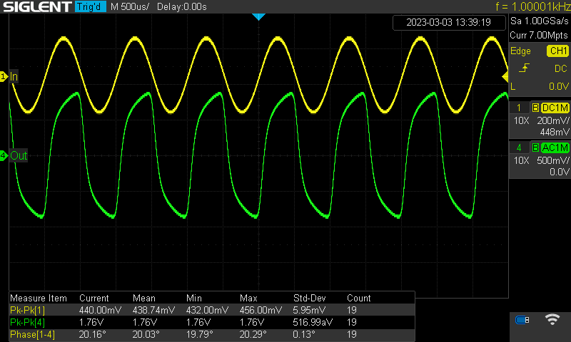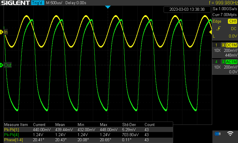 Debajo del pantallazo aparecen las medidas de amplitud punto a punto de las ondas de entrada y salida, así como el desplazamiento de fase. Como podéis ver, el aumento de señal no es poca cosa y esta aparece sin recorte aunque con alguna distorsión. En la siguiente los mandos están igual excepto porque el Level está al máximo. Como la salida se sale de escala he cambiado la sensibilidad del canal verde a 500mV: