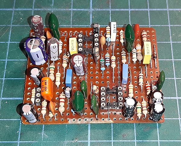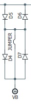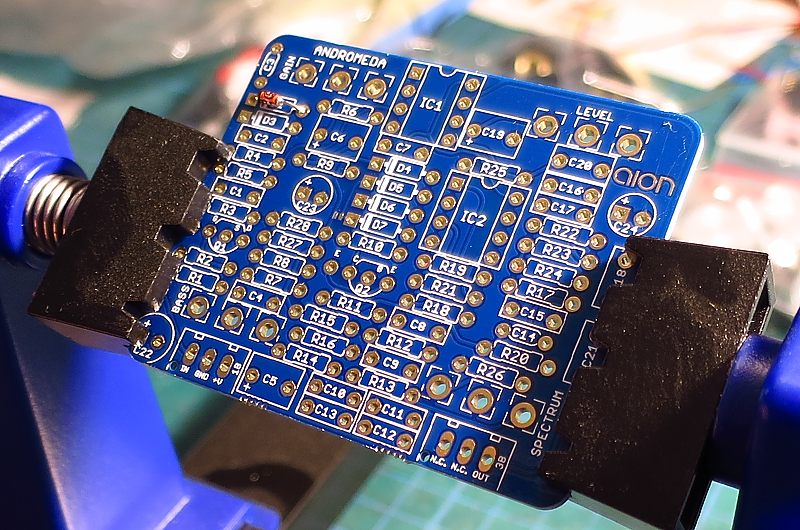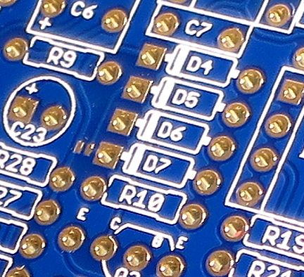 Como podéis ver en paralelo con D4 y D7 hay un trazo representando un puente (jumper) que anula eléctricamente estos dos diodos, dejando esta parte del circuito como en el original ODR-1, esto es, con sólo una pareja de diodos en antiparalelo. Es el truco que inicialmente usé yo en mi proyecto, sustituyendo el puente por un interruptor de modo que sea seleccionable y que ya conté que era completamente inútil. Pues bien, no hay mención alguna en el texto del Andromeda que explique que en la placa hay un par de minúsculos pads para poder poner un puente y así anular el segundo juego de diodos pues tal y como viene la placa, los cuatro diodos están activos. Fijáos bien en el detalle:
