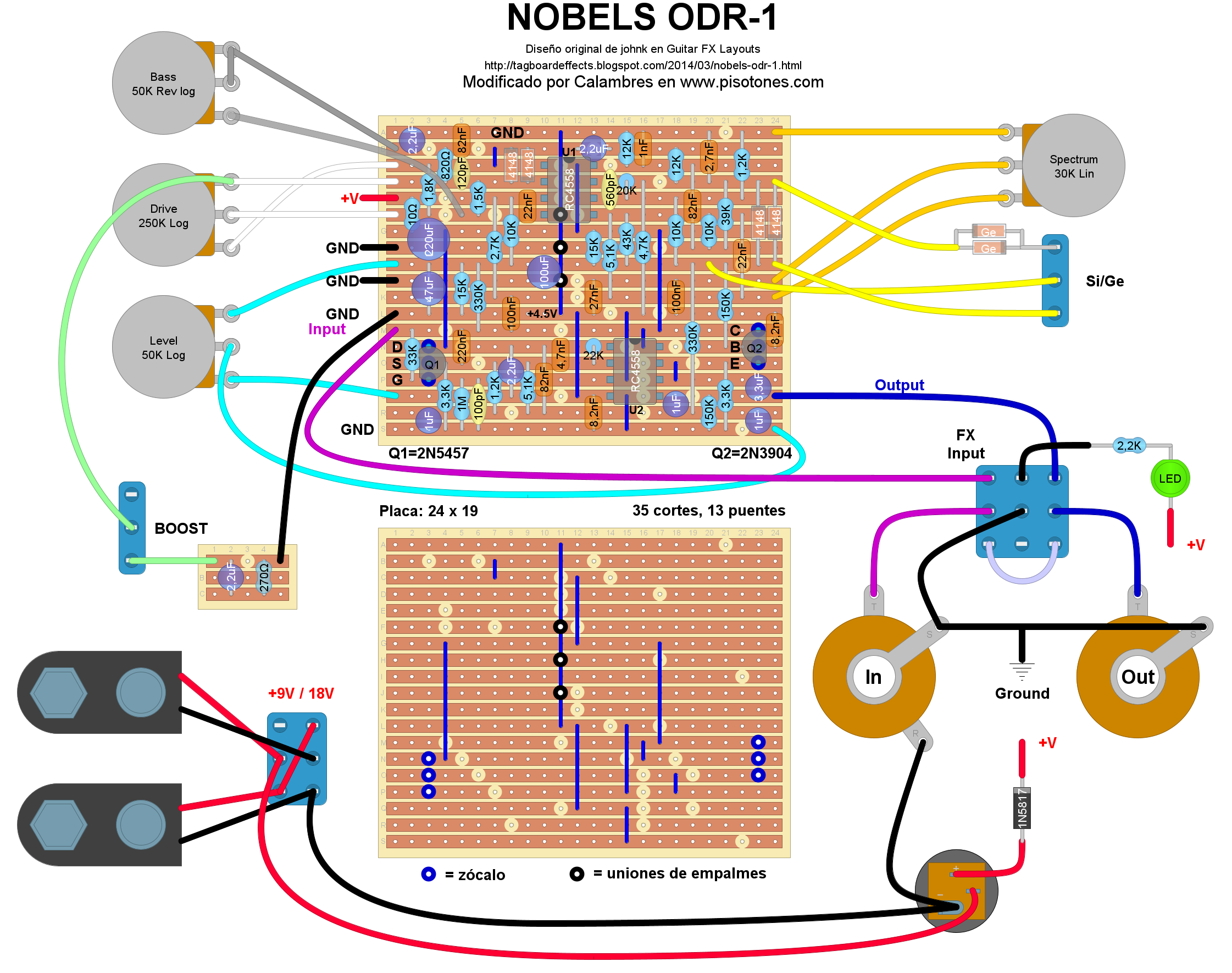 Como ya he dicho antes este pedal peca, si es que este es el término correcto, de un poco de graves de más, lo que hace que suene muy profundo y amplio cuando tocamos nosotros solos pero puede hacer que "choque" con otros instrumentos en un entorno de banda (bajo, teclados...). En guitarras tipo Fender puede ser deseable según el caso pero con guitarras con humbuckers o pastillas con más amplio rango puede ser contraproducente. Esto han intentado paliarlo un poco en la versión actual del pedal mediante un pequeño conmutador de recorte de graves que está alojado en el compartimento de la pila al que, en este pedal, se accede desde la zona superior, algo muy de agradecer cuando lo tenemos fijado en una pedalera. Hay actualmente otro modelo original de Nobels de este pedal, en caja súper pequeña (ODR-Mini) y sin capacidad de pila, que no lleva este conmutador pero indican que tiene el registro de graves retocado para que no sea tan prominente. Yo lo he probado y aún así me parece que va un tanto pasado de graves que, insisto, cuando lo usas tú solo en tu casa suena fenomenal... precioso, pero en entorno de banda no lo tengo tan claro si no lo ecualizas un poco a posteriori. Por esa razón en este montaje muestro un ODR-1 con un control extra de "BASS" que nos permitirá regular esto a gusto, sabiendo que con el control a tope es como si no estuviese, como en el original.
