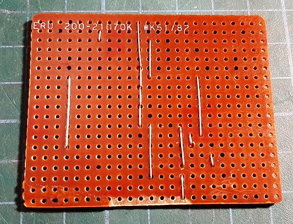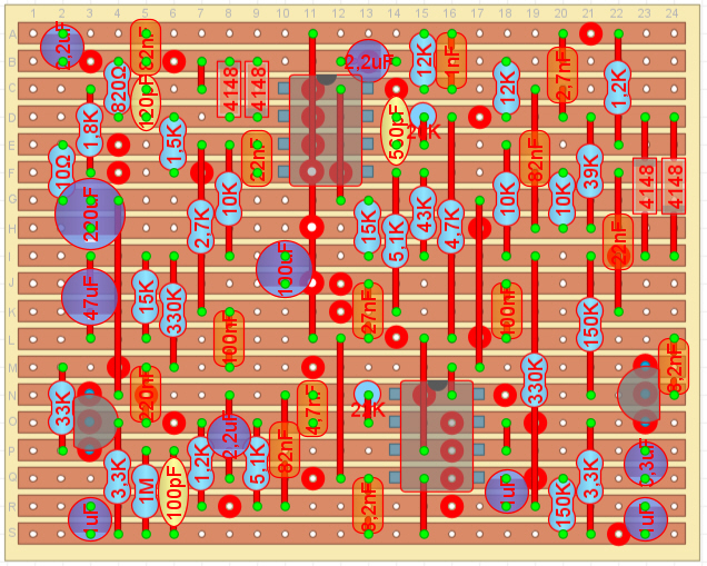 Como suelo hacer últimamente, propongo una placa de tipo VeroBoard (preperforada de tiras de cobre) por ser bastante sencilla de hacer. Para eso me baso en el muy probado diseño de johnk en la web Guitar FX Layouts al que le he hecho algunas modificaciones. En dicha web podéis ver dos versiones que difieren solamente en el J-FET utilizado: una para el 2N5457 (patillaje DSG) y otra para el SK30A-Y (patillaje DGS). He partido de la primera pues el SK30A-Y no es nada fácil de conseguir por estos lares, para luego modificarla tal que admita las modificaciones propuestas: