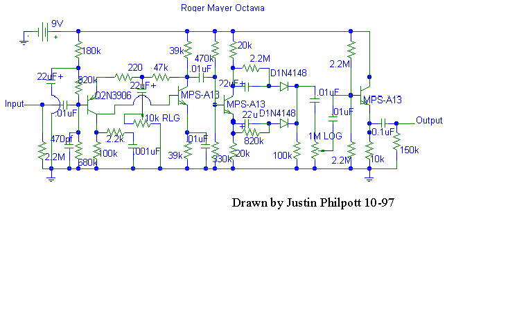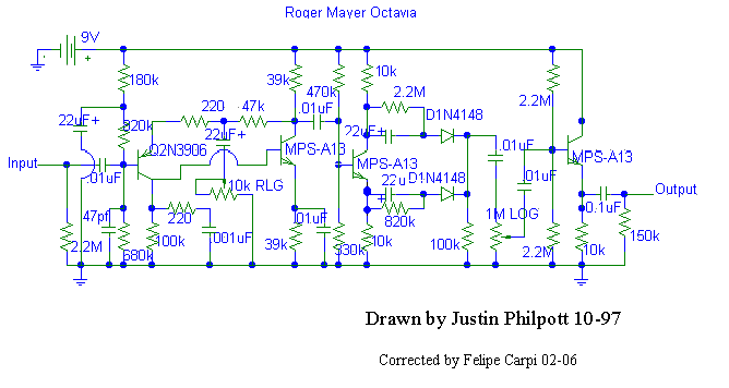 Electrónicamente, este circuito tiene unas particularidades que merece la pena comentar. Utiliza cuatro transistores como habéis podido ver. Los tres MPSA13 son de un tipo especial llamados "Darlington" de tipo NPN que en realidad son dos transistores en un sólo encapsulado y puestos en "cascada" con lo que la ganancia que se obtiene de cada uno es enorme. Puede que os cueste un poco encontrarlos. Si es así buscad los BC517, mucho más comunes y equivalentes. Yo los he usado también y suenan muy bien.